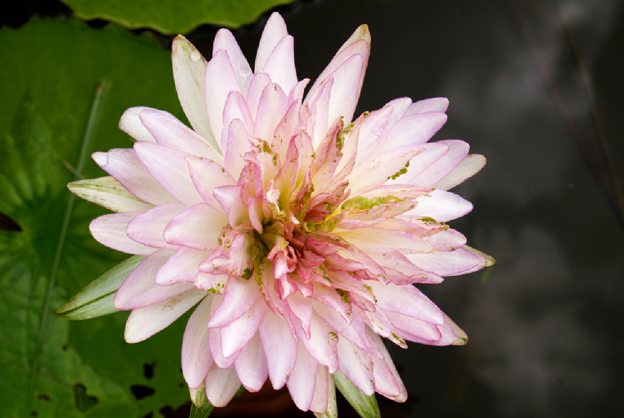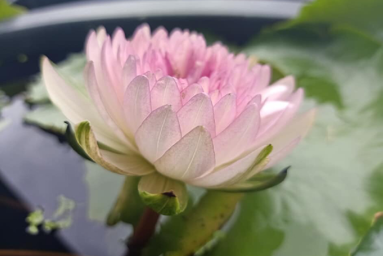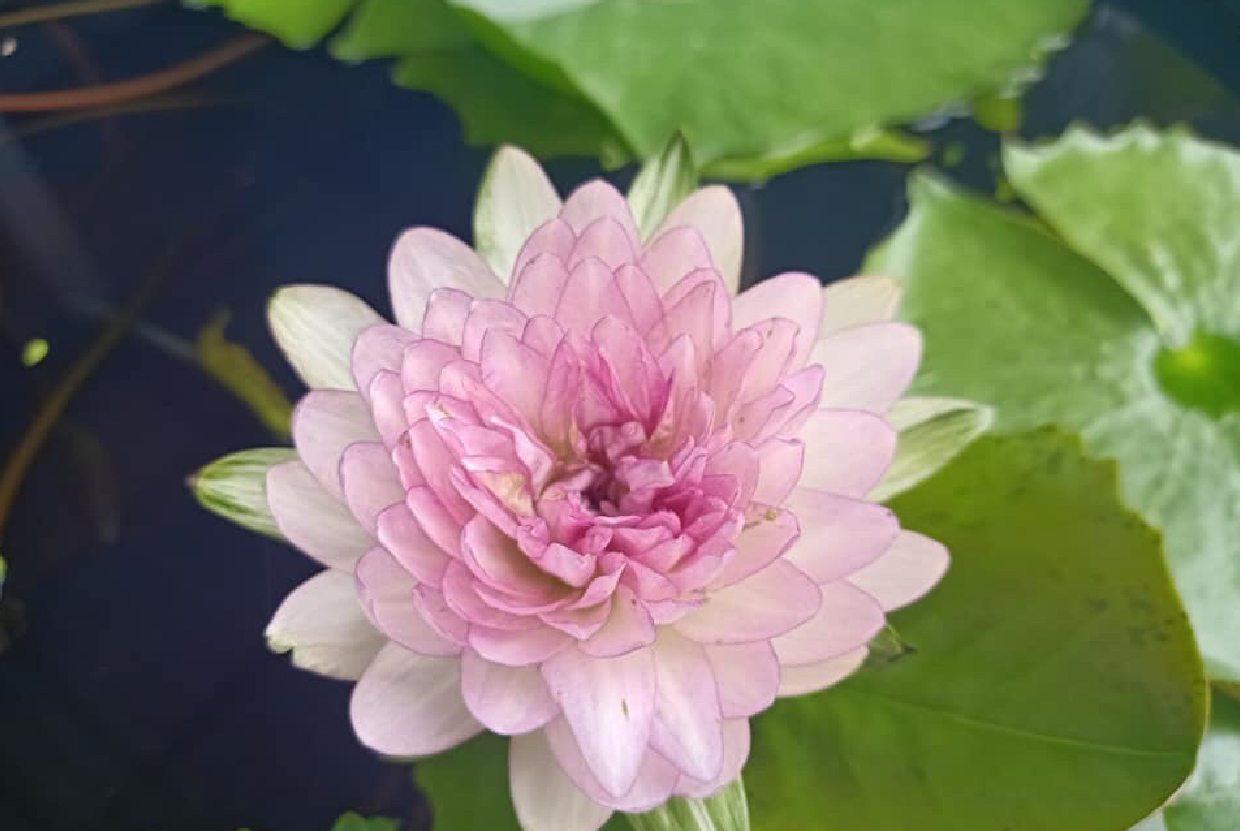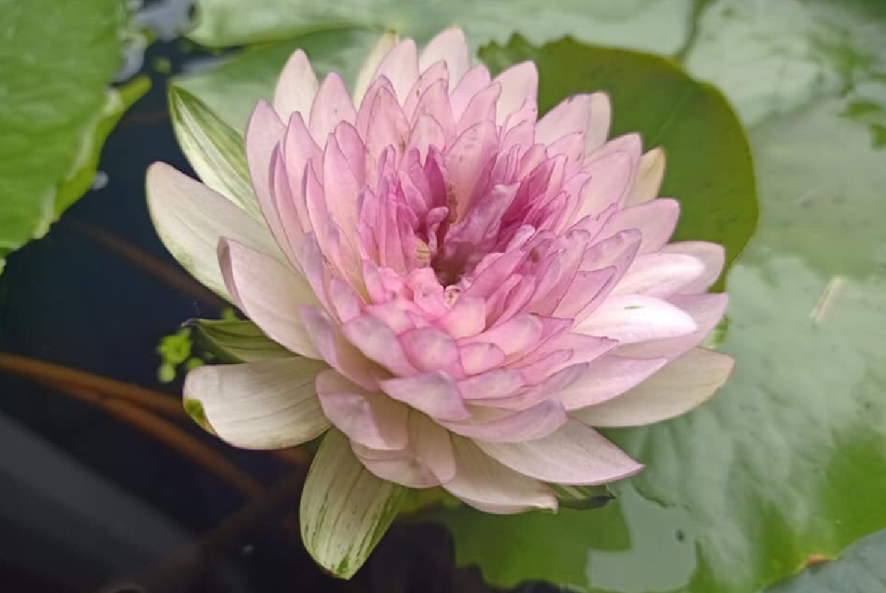 กลีบดอกรูปรีแคบ โคนกลีบกว้าง ปลายกลีบเรียวแหลม กลีบชันนอกและกลีบชันในมีสีชมพูอ่อน ปลายกลีบดอกสีชมพูเข้ม มีกลีบเลี้ยงด้านนอกสีเขียวขี้ม้า ด้านในสีเดียวกับกลีบดอก กลีบดอกซ้อนมากเป็นพิเศษไม่มีก้านชูเกสรเพศผู้