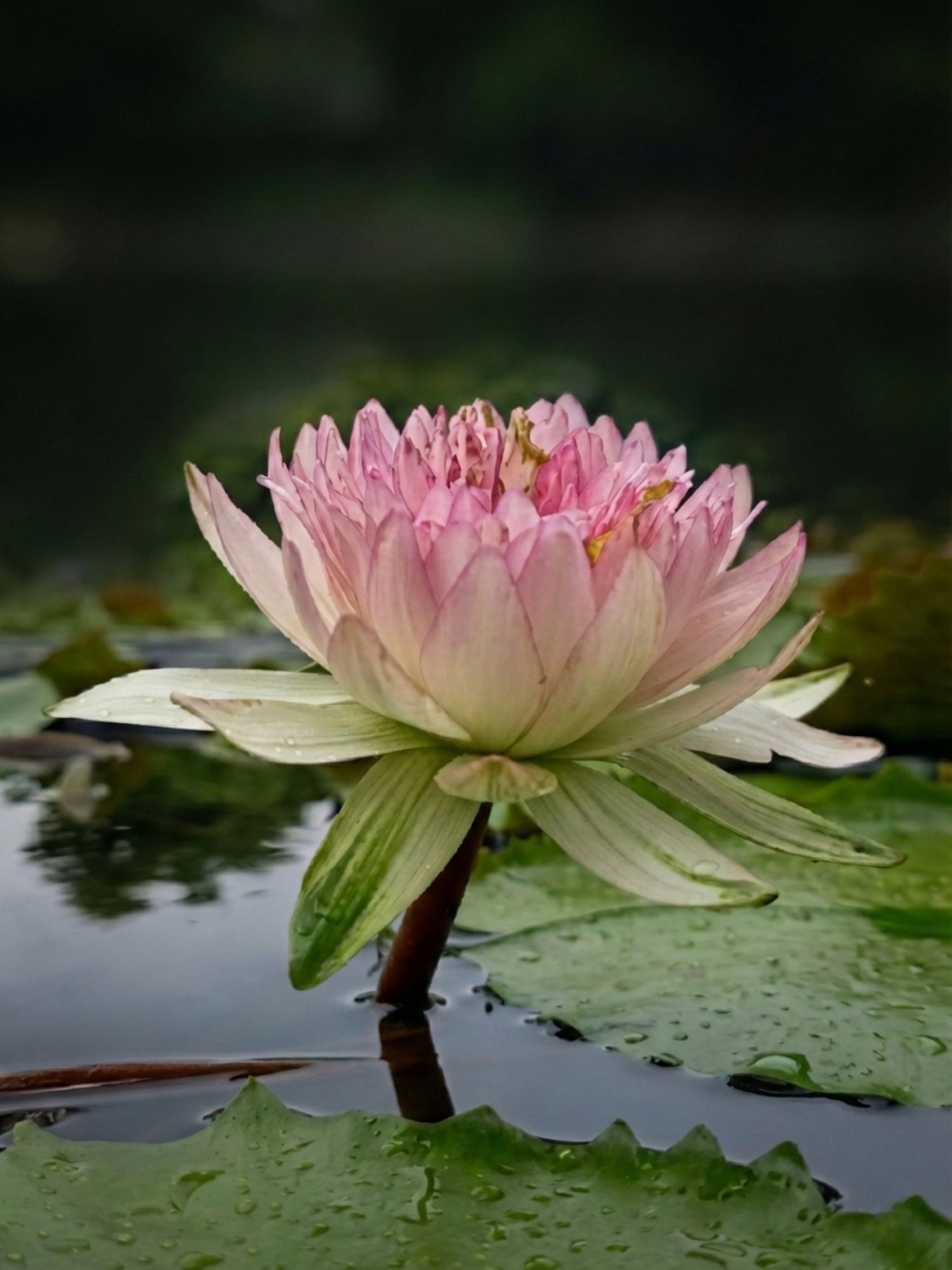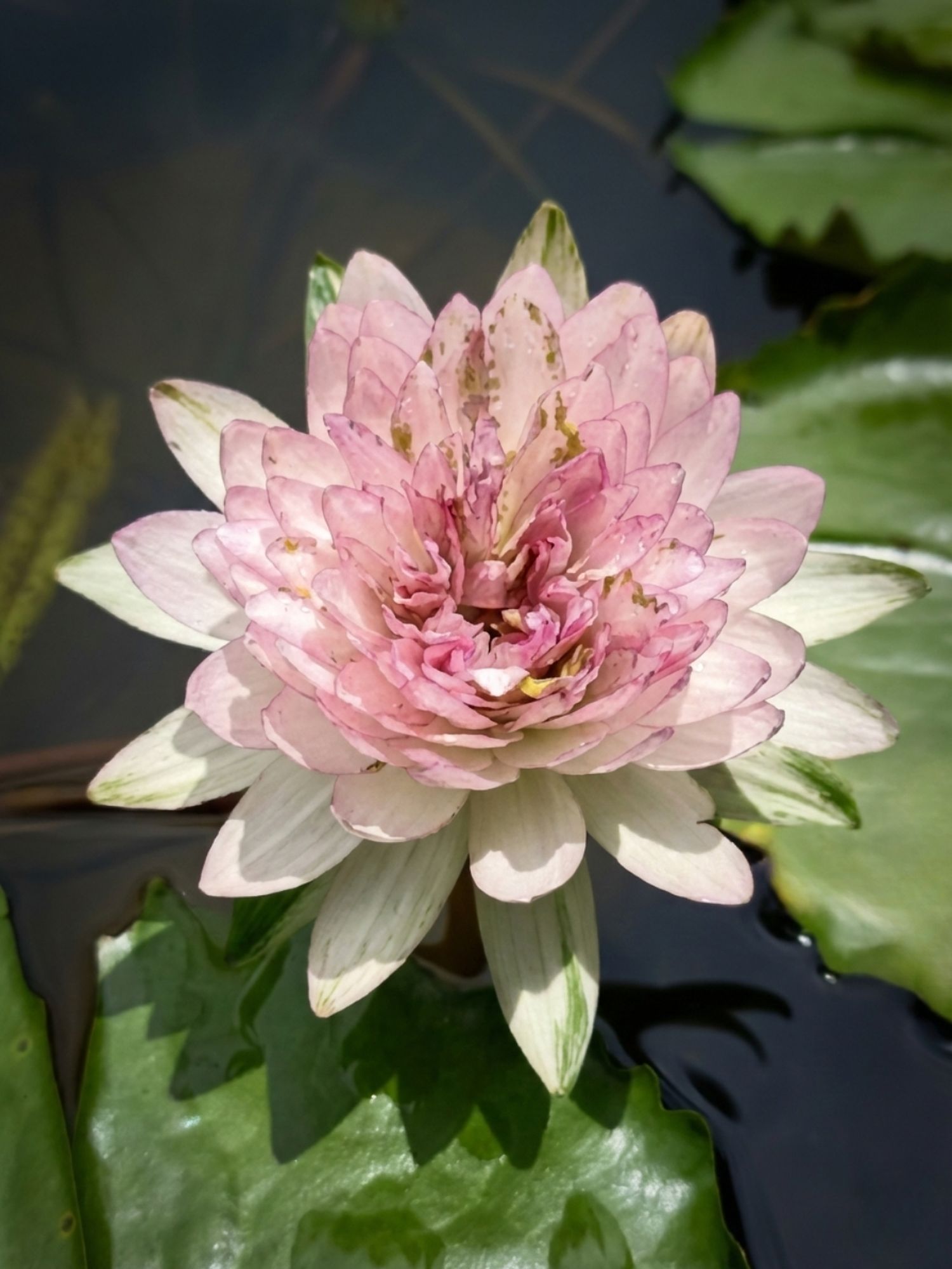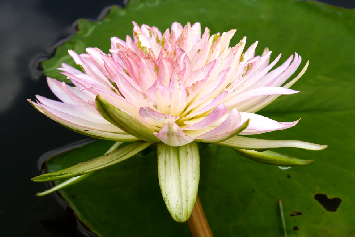 กลีบดอกรูปรีแคบ โคนกลีบกว้าง ปลายกลีบเรียวแหลม กลีบชันนอกและกลีบชันในมีสีชมพูอ่อน ปลายกลีบดอกสีชมพูเข้ม มีกลีบเลี้ยงด้านนอกสีเขียวขี้ม้า ด้านในสีเดียวกับกลีบดอก กลีบดอกซ้อนมากเป็นพิเศษไม่มีก้านชูเกสรเพศผู้