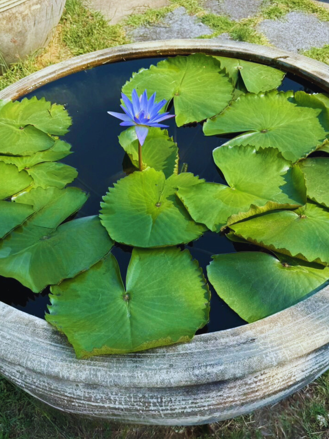 กลีบดอกรูปไข่ ปลายกลีบแหลม กลีบชันนอกและกลีบชันในมีสีฟ้าโคนกลีบสีขาวอมฟ้า  มีกลีบเลี้ยงด้านนอกมีสีเขียว  กลีบเลี้ยงด้านในมีสีขาวเหลือบชมพู  ก้านชูเกสรเพศผู้สีเหลืองปลายก้านม่วงอับละอองสีเหลือง